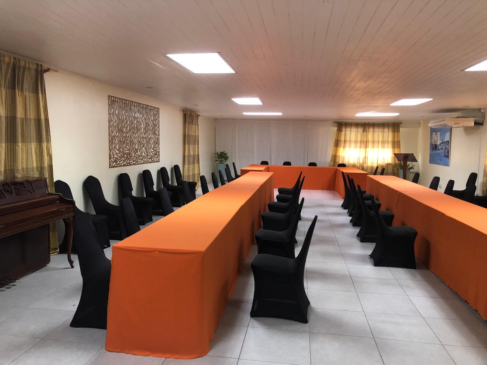 Projector, Screen, Desktop, Webcam, Desk mic, Podium, P.A. System, Flip chart stands, Markers. Other equipment is available upon request.